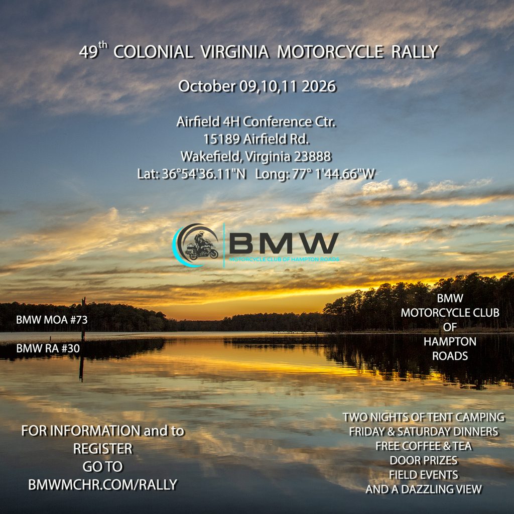 Come join the fun and celebrate the BMW Motorcycle Club of Hampton Roads 48th annual rally. All makes of bikes are welcome. We will be at a new location the 4-H Airfield Conference Center at 15189 Airfield Rd, Wakefield, VA, 23888 (36º 54′ 58.85″, -77º 1′ 40.95″). We will be in the Point Yancey Building and the surrounding grounds. This facility offers many interesting amenities.